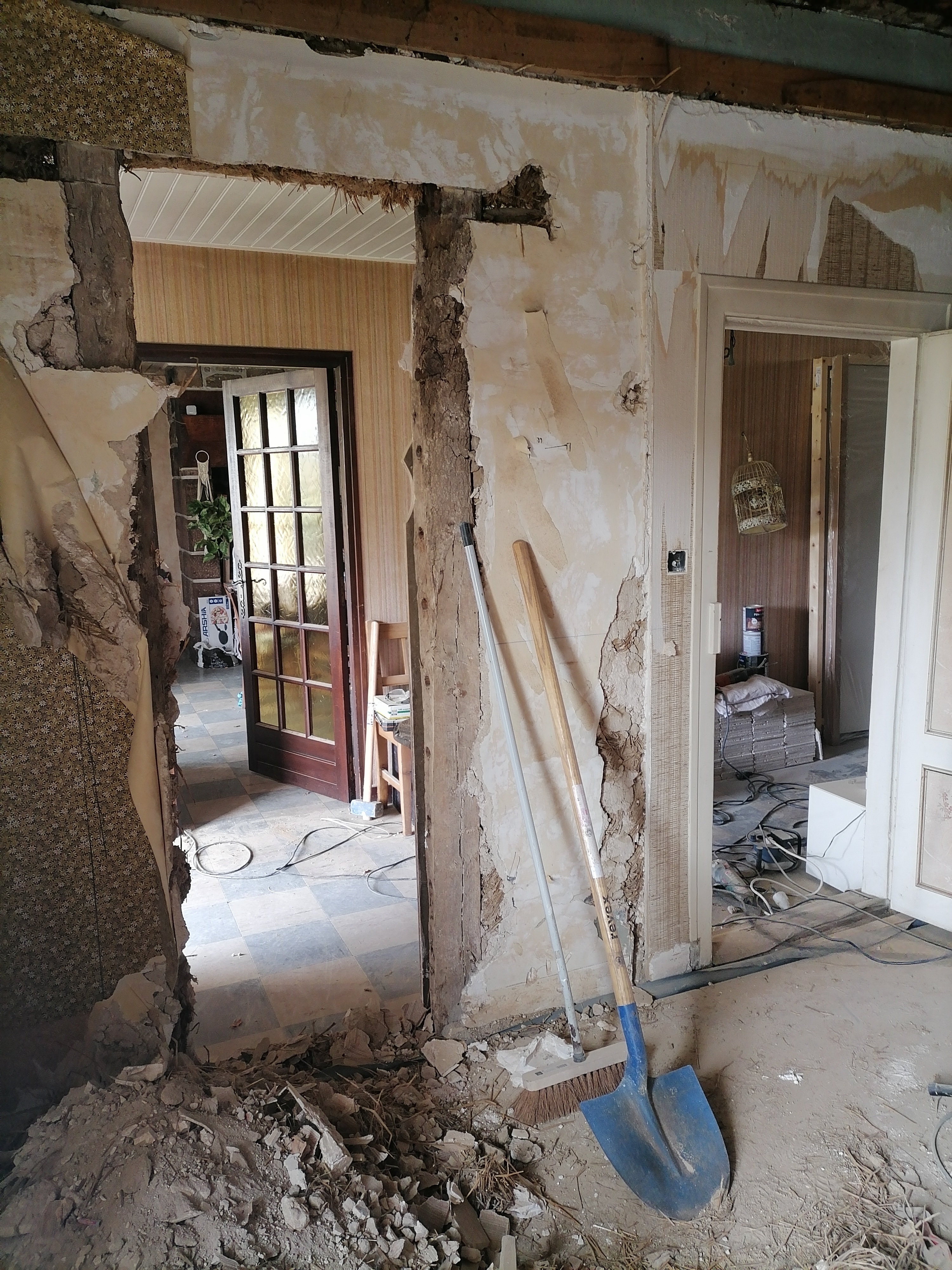 Et au milieu de tout cela, une magnifique découverte : une cheminée en pierre, cachée derrière du placo depuis des années.
